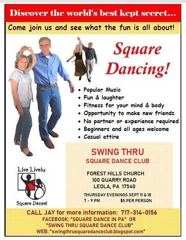 For groups who regularly square and round dance, Dan calls squares for beginners through the Advanced programs. Kathy cues rounds for beginners through those dancing phase 4.